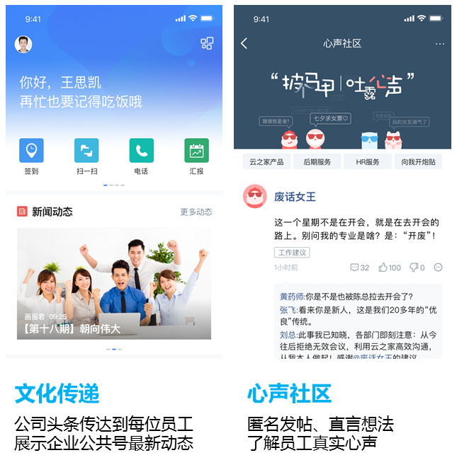 宋凱認(rèn)為,傳統(tǒng)的企業(yè)文化建設(shè)缺少互動(dòng),說教的方式讓年輕人難以接受。云之家同事圈通過線上互動(dòng)社區(qū)把員工召集在一起,建立新生代的企業(yè)文化。