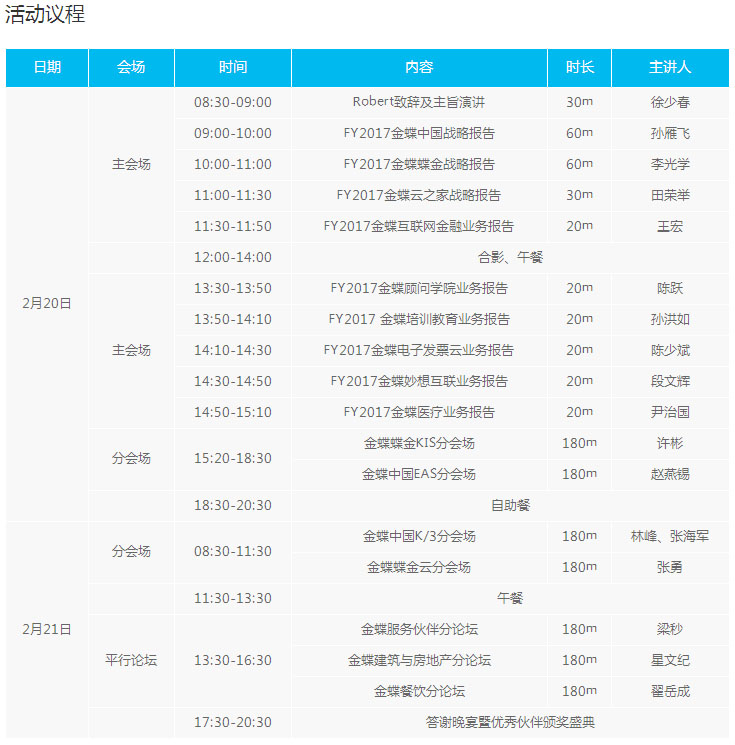 金蝶中國(guó)與金蝶蝶金2017年重點(diǎn)戰(zhàn)略規(guī)劃;金蝶產(chǎn)品與渠道業(yè)務(wù)規(guī)劃、優(yōu)秀渠道合作伙伴經(jīng)營(yíng)與管理經(jīng)驗(yàn)分享。
